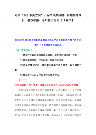 2025年国企党委书记带头严守政治纪律和政治规矩等四个方面存在的主要问题、整改措施个人对照检查发言材料(四个带头)与2024年对照检查报告材料整改建议2篇文2025年国企党委书记带头严守政治纪律和政治规矩等四个方面存在的主要问题、深层次原因分析、努力方向和整改措施个人对照检查发言材料(四个带头)按照《关于认真开好2024年度民主生活会的通知》要求,本人深入学习贯彻习近平新时代中国特色社会主义思想和党的二十届三中全会精神,对标对表党中央决策部署和省委、市委工作要求,深刻检视反思自身存在的问题和不足...