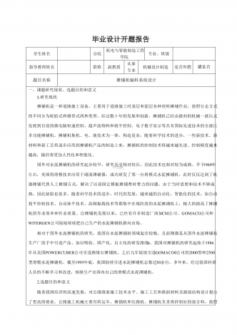 毕业设计开题报告学生姓名分院机电与智能制造工程学院专业、班级指导教师姓名职称副教授从事专业机械设计制造是否外聘R是否题目名称摊铺机输料系统设计一、课题研究现状、选题目的和意义1.研究现状摊铺机是一种道路施工设备,主要用于道路施工时基层和面层各种材料摊铺作业,按照行走方式的不同分为轮胎式和履带式两种类型。经过数十年的发展和创新,摊铺机已经由最初的机械一液压式发展到目前的微电脑恒速控制、超声波物料和找平控制、电子数字显示等具有国际先进技术的全液压多功能摊铺机。摊铺机集机、电、液技术为一体,构造复杂,...