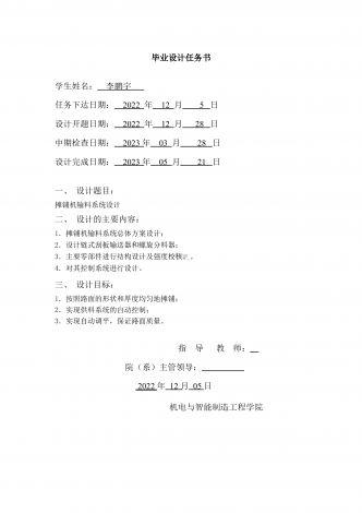 毕业设计任务书学生姓名:李鹏宇任务下达日期:2022年12月5日设计开题日期:2022年12月28日中期检查日期:2023年03月28日设计完成日期:2023年05月21日一、设计题目:摊铺机输料系统设计二、设计的主要内容:1.摊铺机输料系统总体方案设计;2.设计链式刮板输送器和螺旋分料器;3.主要零部件进行结构设计及强度校核。。4.对其控制系统进行设计。三、设计目标:1.按照路面的形状和厚度均匀地摊铺;2.实现供料系统的自动控制;3.实现自动调平,保证路面质量。指导教师:院(系)主管领导:20...