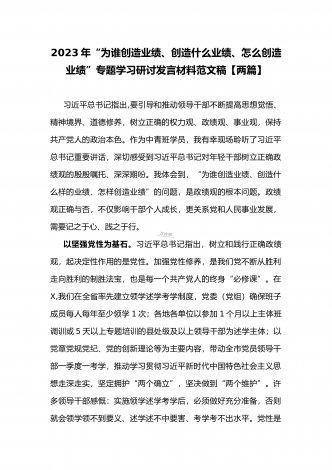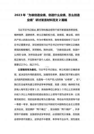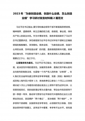 2023年组织部长学习“为谁创造业绩、创造什么业绩、怎么创造业绩”专题交流研讨发言材料1740字范文党的十八大以来,习近平总书记高度重视党员干部政绩观问题,发表了一系列重要论述,作出了一系列重要指示,通过本次主题教育,我认真学习领会了坚持正确政绩观的丰富内涵和实践要求,深刻理解了“为谁创造业绩、创造什么业绩、怎么创造业绩”这一重要问题。下面,结合工作实际和个人体会,从三个方面与大家共同交流,不妥之处,请批评指正。一是强化党性修养,坚守初心使命。树立和践行正确政绩观,起决定性作用的是党性。习近平总...