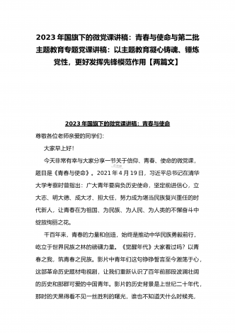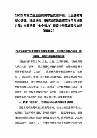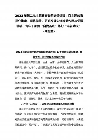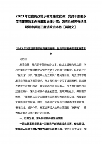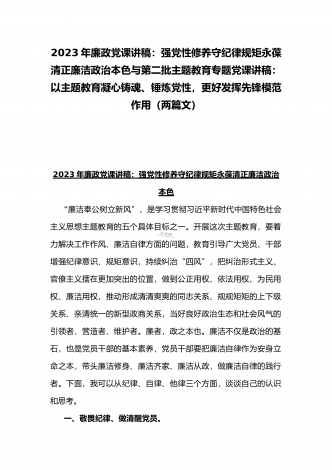 2023年廉政党课讲稿:强党性修养守纪律规矩永葆清正廉洁政治本色与第二批主题教育专题党课讲稿:以主题教育凝心铸魂、锤炼党性,更好发挥先锋模范作用(两篇文)