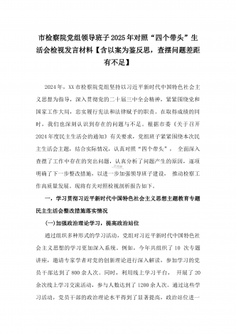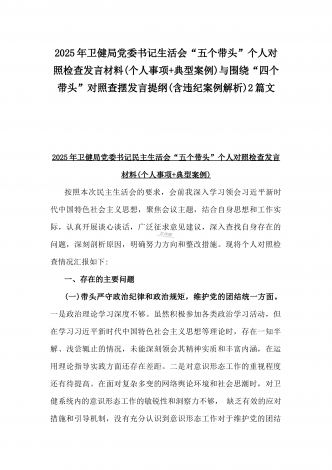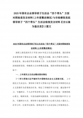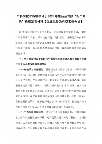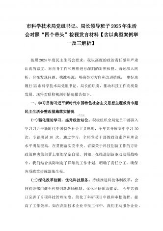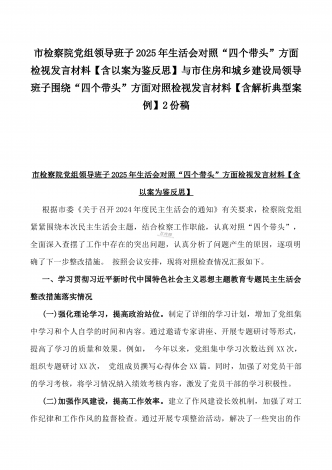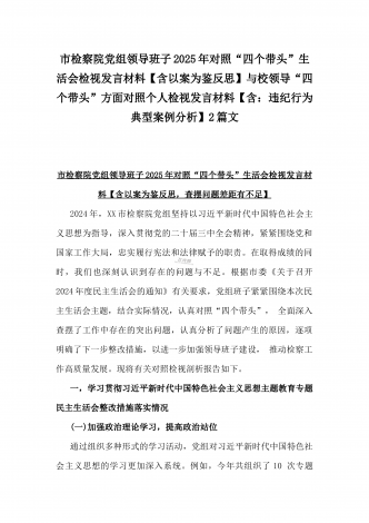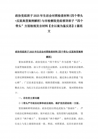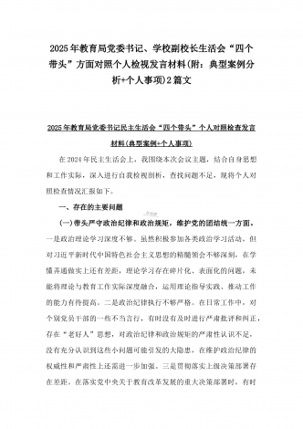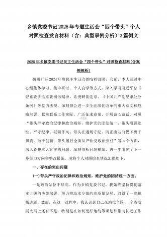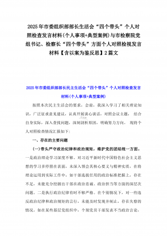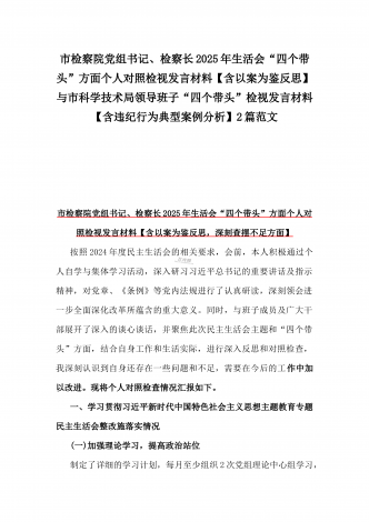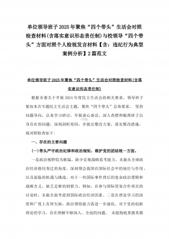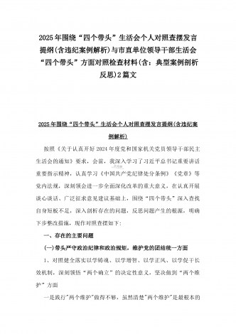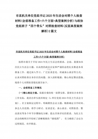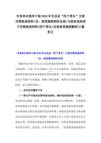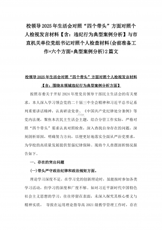 校领导2025年生活会对照“四个带头”方面对照个人检视发言材料【含:违纪行为典型案例分析】与市直机关单位党组书记对照个人检查材料(会前准备工作+六个方面+典型案例分析)2篇文