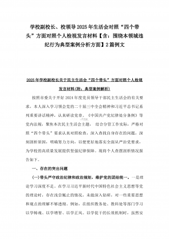 校领导2025年生活会对照“四个带头”方面对照个人检视发言材料【含:违纪行为典型案例分析】与市直机关单位党组书记对照个人检查材料(会前准备工作+六个方面+典型案例分析)2篇文校领导2025年生活会对照“四个带头”方面对照个人检视发言材料【含:围绕本领城违纪行为典型案例分析方面】按照市委关于开好2024年度党员领导干部民主生活会的有关要求,本人深入学习领会党的二十届三中全会精神和习近平总书记系列重要讲话精神,认真研读党章、《中国共产党纪律处分条例》等党内法规,聚焦本次民主生活会主题,结合分管工作实...