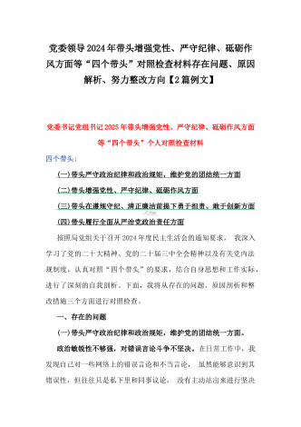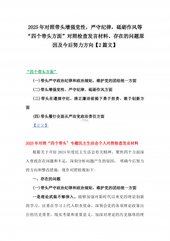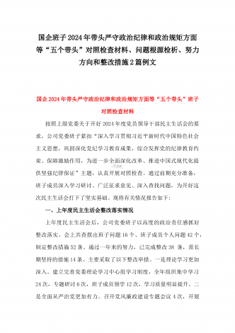 国企党委书记、分管农业副乡长2025年在带头严守政治纪律和政治规矩方面等“四个方面”个人对照检查材料、发言材料、存在问题、原因分析及措施材料(2篇文)国企党委书记2025年带头严守政治纪律和政治规矩方面等“四个方面”个人对照检查材料按照上级党委关于开好2024年度党员领导干部民主生活会的要求,我紧扣“深入学习贯彻习近平新时代中国特色社会主义思想,巩固深化党纪学习教育成果,综合发挥党的纪律教育约束、保障激励作用,为进一步全面深化改革、推进中国式现代化提供坚强纪律保证”主题,结合企业实际,深入查找问...