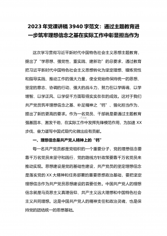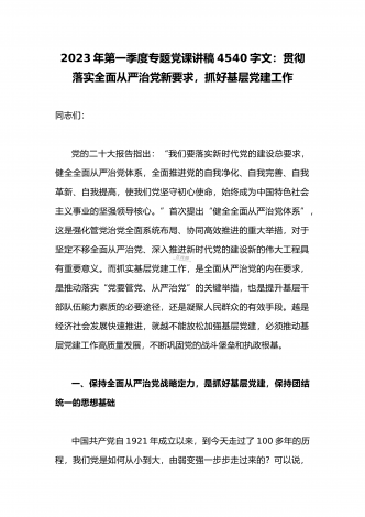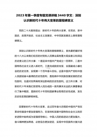 2023年党课讲稿2020字范文:学思践悟强党性,执法为民新征程同志们:按照局党委工作安排和主题教育工作要求,今天我来给大家上一堂专题党课,主题是“学思践悟强党性,执法为民新征程。主要是想和大家一起深入学习贯彻习近平新时代中国特色社会主义法治思想,进一步提高政治站位,强化执法为民的责任担当,用思想武器强化全市XX执法工作高质量发展。在召开这一堂党课之前,我先反复研读了党的XX大报告,尤其是反复研读了和我支队相关的第七部分“坚持全面依法治国,推进法治中国建设”等内容,不断加深了对“加快建设法治社会...