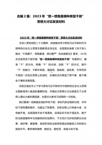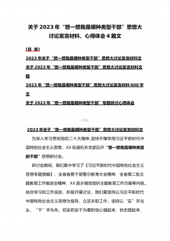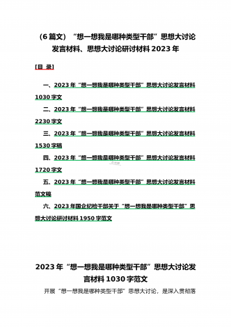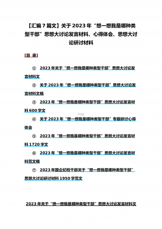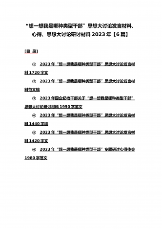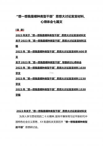 【汇编7篇文】关于2023年“想一想我是哪种类型干部”思想大讨论发言材料、心得体会、思想大讨论研讨材料[目录]① 2023年关于“想一想我是哪种类型干部”思想大讨论发言材料文② 关于2023年“想一想我是哪种类型干部”思想大讨论发言材料文稿③ 2023年“想一想我是哪种类型干部”思想大讨论发言材料600字文④ 关于2023年“想一想我是哪种类型干部”专题研讨心得体会⑤ 2023年“想一想我是哪种类型干部”思想大讨论发言材料1720字文⑥ 2023年“想一想我是哪种类型干部”思想大讨论发言材料范文...