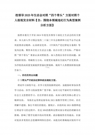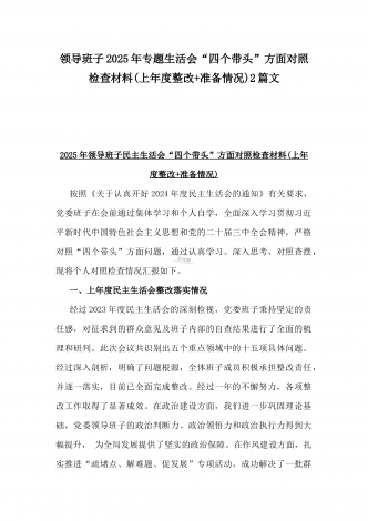 幼儿园党支部2025年组织生活会领导班子树立正确“五观”、增强“五个认同”等五个方面对照检视发言材料与国有企业领导班子“四个带头”方面对照检查发言材料2篇文幼儿园党支部2025年组织生活会领导班子树立正确“五观”、增强“五个认同”等五个方面对照检视发言材料按照开好2024年度组织生活会的安排部署,会前,党支部班子通过个人自学和集体学习,深入学习领会习近平总书记重要讲话重要指示精神,认真学习党章、《条例》等党内法规,深刻领会进一步全面深化改革的重大意义,通过与班子成员和广大教师、党员进行了谈心谈话...