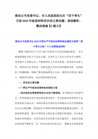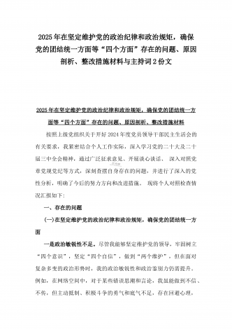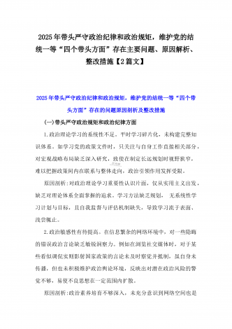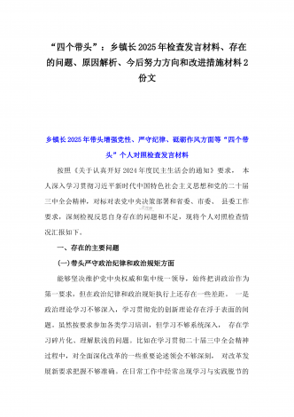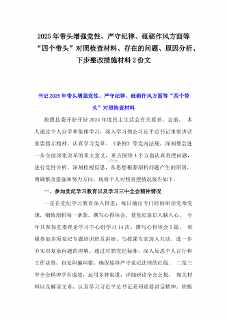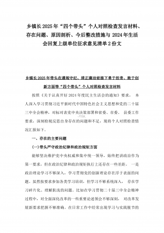 2024年生活会回复上级单位征求意见清单与2025年围绕带头增强党性、严守纪律、砥砺作风等“四个带头方面”个人对照检查材料、存在问题、原因剖析、今后整改措施2份文