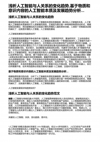 浅析人工智能与人关系的变化趋势,基于物质和意识内容的人工智能本质及发展趋势分析...浅析人工智能与人关系的变化趋势根据物质和意识的内容,分析了人工智能的本质和发展趋势...意识和人工智能的关系。人工智能人工智能的本质是相对于人类智能而言的。正是因为意识是一种特殊的物质运动形式,根据控制论的理论,用功能模拟的方法制造计算机来模拟人脑的某些功能,人类的一些智能活动被机械化了,这就是所谓的人工智能。人工智能的基础人工智能发展现状和趋势如何?人工智能塑造新的国家竞争优势作者:冯路博士,互联网研究所,赛迪...