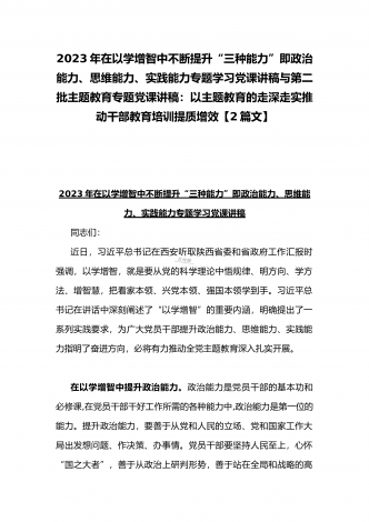 2023年在以学增智中不断提升“三种能力”即政治能力、思维能力、实践能力专题学习党课讲稿与第二批主题教育专题党课讲稿:以主题教育的走深走实推动干部教育培训提质增效【2篇文】