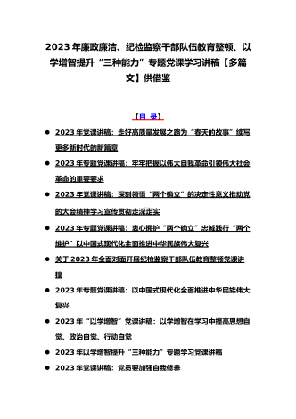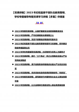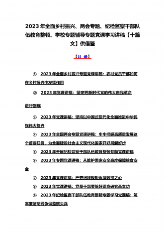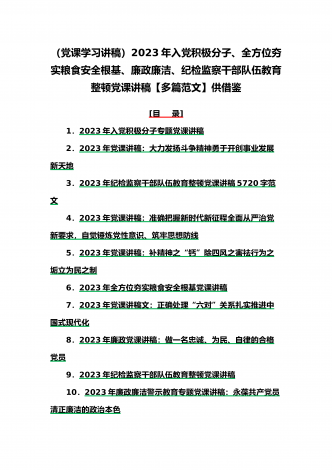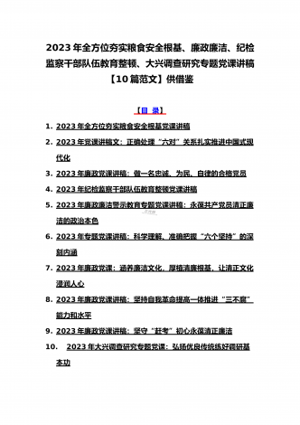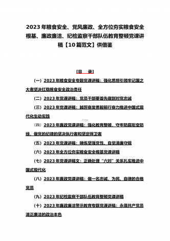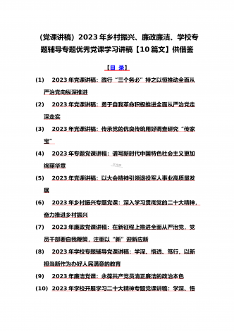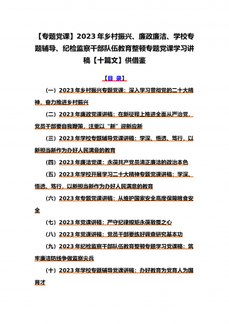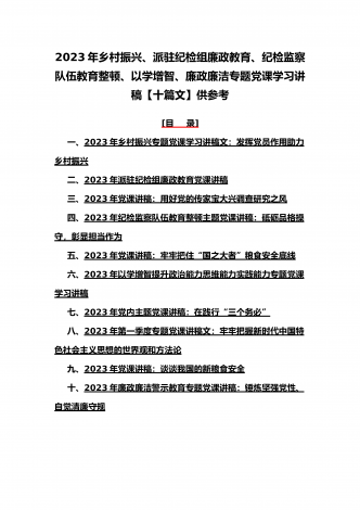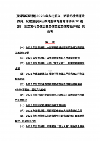 (党课学习讲稿)2023年乡村振兴、派驻纪检组廉政教育、纪检监察队伍教育整顿专题党课讲稿10篇【附:坚定文化自信历史自信自立自信专题讲稿】供参考[目录](一)2023年党课讲稿:一刻不停推进全面从严治党为高质量发展保驾护航(二)2023年党课讲稿:以更高质量办好人民满意的教育(三)2023年党课讲稿:心怀“国之大者”,树牢总体国家安全观(四)2023年廉政党课文:坚定不移全面从严治党奋力开创发展新局面(五)2023年坚定文化自信历史自信自立自信专题党课讲稿4860字范文:坚定文化自信(六)202...