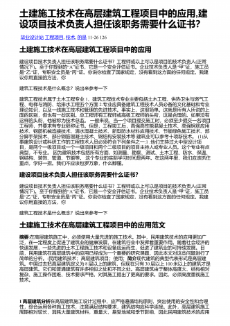 土建施工技术在高层建筑工程项目中的应用,建设项目技术负责人担任该职务需要什么证书?毕业设计站工程项目,技术,的是11-26126土建施工技术在高层建筑工程项目中的应用建设项目技术负责人担任该职务需要什么证书?工程师或以上可以是项目的技术负责人(正常情况下)“。至于你提到的A”“”证书,它是一个安全评估证书。企业技术负责人是甲证,施工员“”“”是乙证,专职安全员是丙证。你说你检查了国家规定,没有看到这方面的任何规定。我建议你用直接的方法,你建筑工程技术是什么概念?说出来参考一下建筑工程技术属于土木...