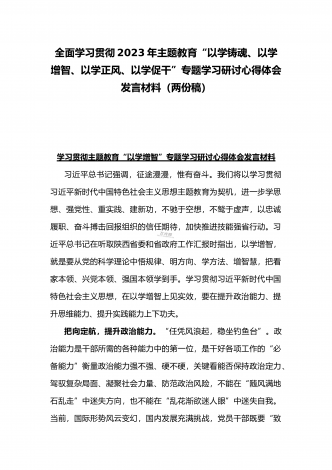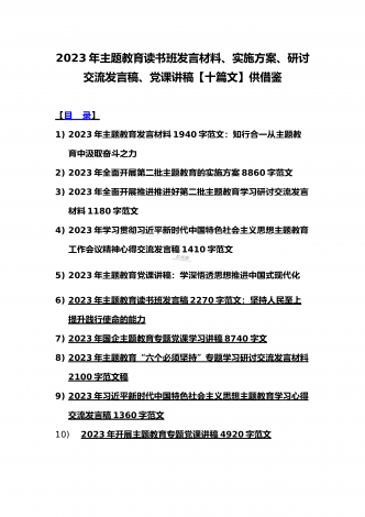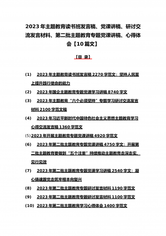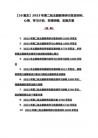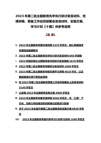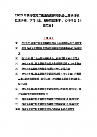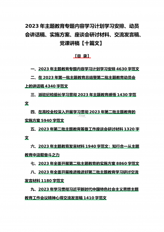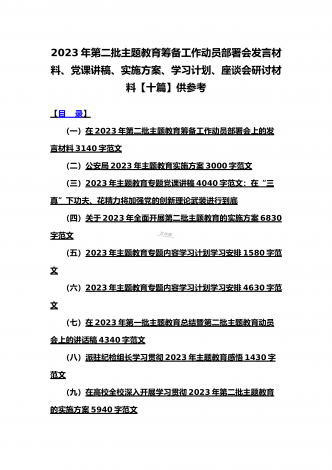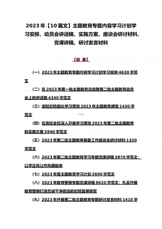 2023年第二批主题教育研讨发言材料、心得、学习计划、党课讲稿、动员大会的讲话稿、专题内容学习计划学习安排【10篇】汇编供参考