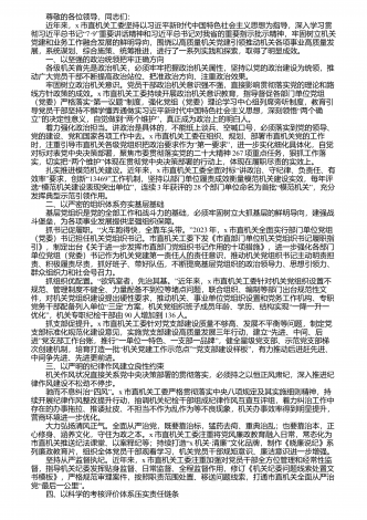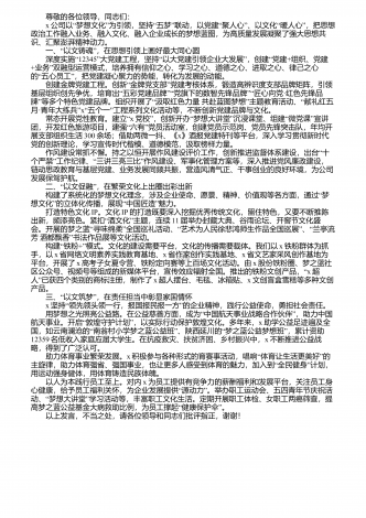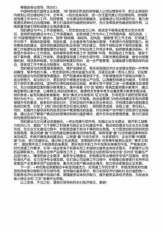 尊敬的各位领导,同志们: “”中国特色现代国有企业制度,特就特在把党的领导融入公司治理各环节,把企业党组织内嵌到公司治理结构之中。近年来,x结合自身实际,进一步注重完善公司治理结构,持续推进党建工作与中心工作、风控管理、文化建设的深度融合,全面推进公司治理现代化,着力将制度优势转化为治理效能,努力打造政府性融资担保标杆,充分发挥政府性融资担保作用,以高质量党建引领和保障企业高质量发展。 党的建设与中心工作深度融合。x党支部自成立以来,就坚定不移落实管党治党主体责任,坚持把党的建设与中心工...