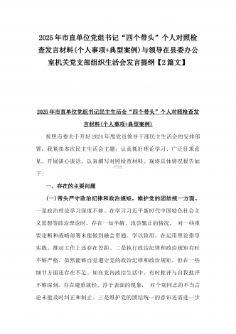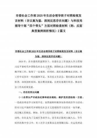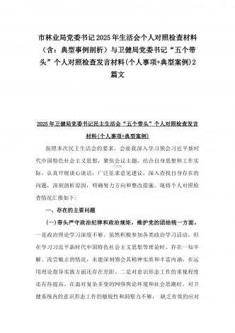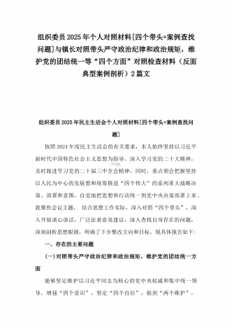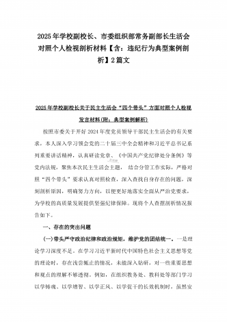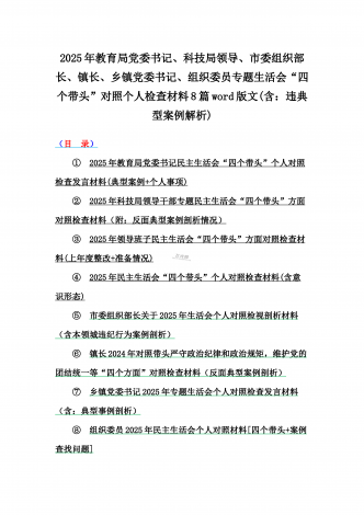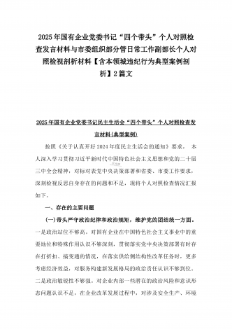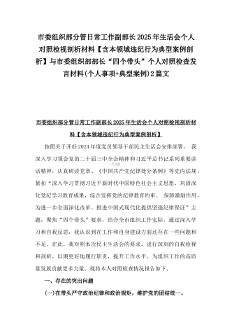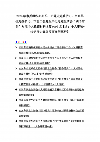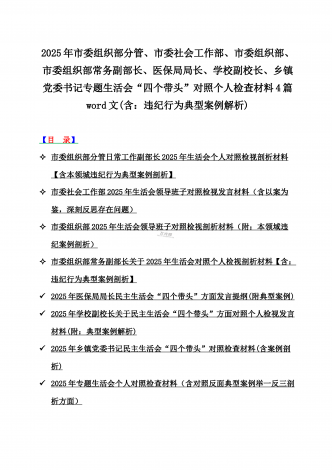 2025年市委组织部分管、市委社会工作部、市委组织部、市委组织部常务副部长、医保局局长、学校副校长、乡镇党委书记专题生活会“四个带头”对照个人检查材料4篇word文(含:违纪行为典型案例解析)【目录】市委组织部分管日常工作副部长2025年生活会个人对照检视剖析材料【含本领城违纪行为典型案例剖析】市委社会工作部2025年生活会领导班子对照检视发言材料(含以案为鉴,深刻反思存在问题)市委组织部2025年生活会领导班子对照检视剖析材料(附:本领域违纪案例剖析)市委组织部常务副部长关于2025年...