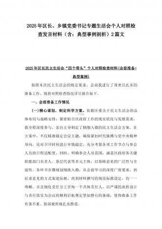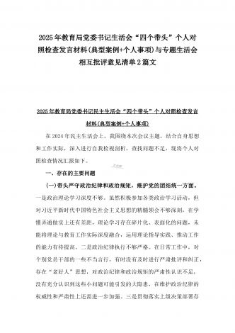 2025年市委组织部分管、市委社会工作部、市委组织部、市委组织部常务副部长、医保局局长、学校副校长、乡镇党委书记专题生活会“四个带头”对照个人检查材料4篇word文(含:违纪行为典型案例解析)