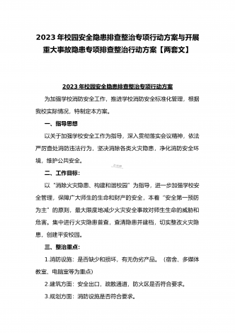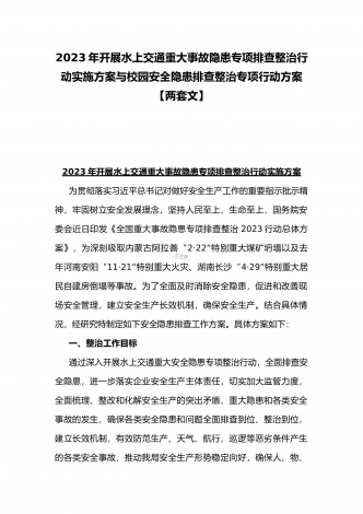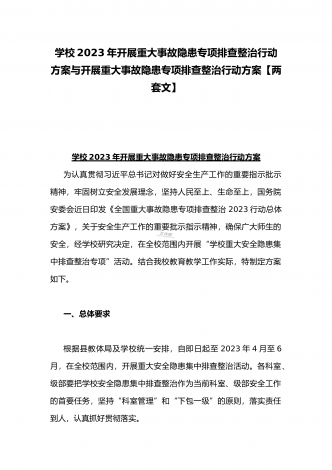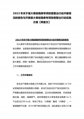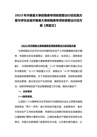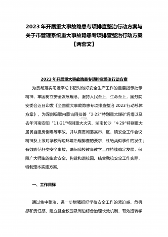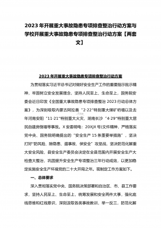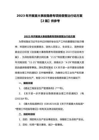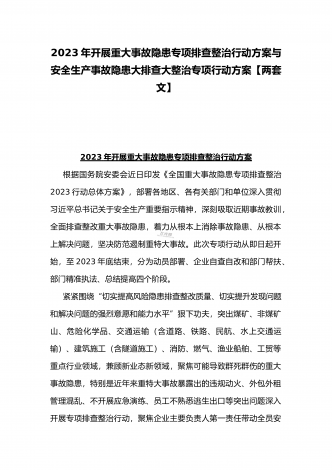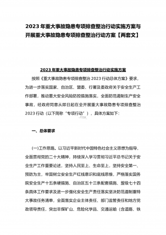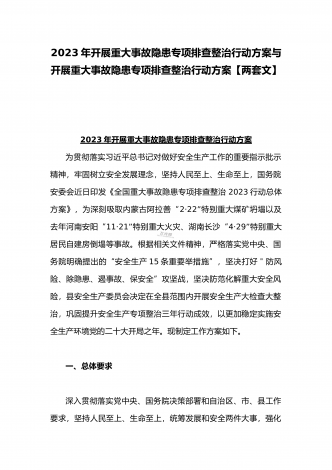 2023年开展重大事故隐患专项排查整治行动方案与在重大事故隐患专项排查整治行动动员部署会上的讲话稿【两套文】2023年开展重大事故隐患专项排查整治行动方案为贯彻落实习近平总书记对做好安全生产工作的重要指示批示精神,牢固树立安全发展理念,坚持人民至上、生命至上,国务院安委会近日印发《全国重大事故隐患专项排查整治2023行动总体方案》,为深刻吸取内蒙古阿拉善“2·22”特别重大煤矿坍塌以及去年河南安阳“11·21”特别重大火灾、湖南长沙“4·29”特别重大居民自建房倒塌等事故。深化贯彻落实《X关于进...