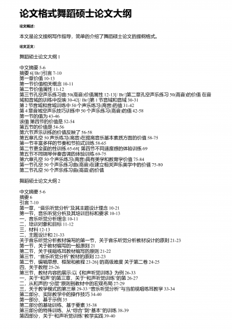 论文格式舞蹈硕士论文大纲论文概述:本文是论文提纲写作指导,简单的介绍了舞蹈硕士论文的提纲格式。论文正文:舞蹈硕士论文大纲1中文摘要5-6摘要6[/Br/]引言7-10第一章价值10-13第一节价值相关概念10-11第二节价值属性11-12第三节孔空声乐练习曲50(高音)价值属性12-13[/Br/]第二章孔空声乐练习50(高音)的价值在音域和音域的训练中反映30-42[/Br/]第1节音域和音域30-31第2节音域和音域训练中50个声乐练习(高音)的值31-42第4章音域空声乐技巧训练中50个声...