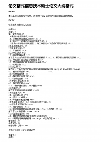 论文格式信息技术硕士论文大纲格式论文概述:本文是论文提纲写作指导,简单的介绍了信息技术硕士论文的提纲格式。论文正文:信息技术硕士论文大纲表1摘要5-7摘要7-8第一章引言11-171.1课题的依据和意义11-131.1.1深反射地震处理方法研究11-121.1.2长江中下游成矿带深部结构研究12-131.2国内外深部勘探研究现状13第二章长江中下游成矿带地质调查17-222.1基底和盖层17-192.2构造演化19-222.2.1印支运动19-202.2.2燕山运动20-212.2.3喜马拉雅运...