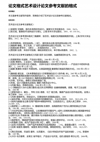 论文格式艺术设计论文参考文献的格式论文概述:本文是参考文献写作指导,简单的介绍了艺术设计论文的参考文献格式。论文正文:艺术设计论文参考文献格式1[1]安妮特·艾姆斯。面向未来的时尚设计[。服装与文本检索杂志,2008,26(2)。[2]张文斌。服装技术(结构设计分册)[。上海:东华大学出版社,2001,05:154-161。艺术设计论文参考资料格式二鲍魏军,张芬芬。袖套式实用服装裁剪手册[。上海:东华大学出版社,2012,06:12-14。[1]布劳顿凯特。纺织品染色。[·米】。美利坚合众国:洛...