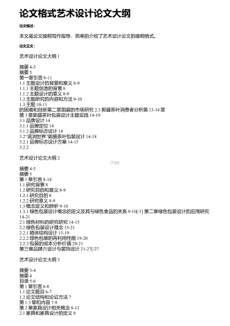 论文格式艺术设计论文大纲论文概述:本文是论文提纲写作指导,简单的介绍了艺术设计论文的提纲格式。论文正文:艺术设计论文大纲1摘要4-5摘要5第一章引言8-111.1主题设计的背景和意义8-91.1.1主题创造的背景81.1.2主题设计的意义8-91.2主题研究的内容和方法9-101.3主题10-11的困难和创新第二章国盛的市场研究2.3郭盛茶叶消费者分析第13-14章第3章郭盛茶叶包装设计主题实践14-193.1品牌设计143.1.1品牌定位143.1.2品牌标志设计143.2“”滋润世界郭盛茶叶...