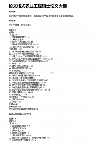 论文格式农业工程硕士论文大纲论文概述:本文是论文提纲写作指导,简单的介绍了农业工程硕士论文的提纲格式。论文正文:农业工程硕士论文大纲1摘要8-9摘要91引言10-151.1研究背景和意义10-111.1.1研究背景101.1.2研究目的和意义10-111.2国内外研究趋势和趋势11-131.2.1国内外研究现状和评论11-12预测模型15-182.2BP神经网络预测模型简介18-262.2.1人工神经网络模型基础18-202.2.2建立BP人工神经网络预测模型20-222.2.2BP人工神经网络...