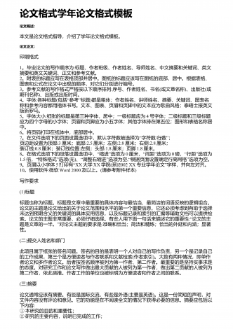 论文格式学年论文格式模板论文概述:本文是论文格式指导,介绍了学年论文格式模板。论文正文:印刷格式1。毕业论文的写作顺序为:标题、作者班级、作者姓名、导师姓名、中文摘要和关键词、英文摘要和英文关键词、正文和参考文献。2。附表的标题应写在表格顶部并居中。图纸的标题应该写在图纸的底部,居中。根据表格、图表和公式在论文中出现的顺序,对它们分别进行编号。3。参考文献的写作格式严格按以下顺序排列:序号、作者姓名、书名(或文章名称)、出版社(或期刊名称)、出版或出版时间。4。字体:各种标题(“”包括参考标题)...