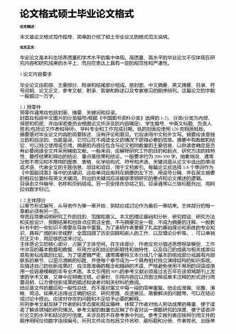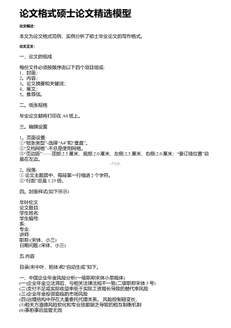 论文格式硕士论文写作标准论文概述:本文是论文写作指导,简单的介绍了硕士论文的写作规范。论文正文:一、学术论文内容:(1)标题(5)作者简介(2)作者签名和工作单元(6)正文(3)摘要(7)注释(4)关键词(8)参考(此外,还有基金项目、致谢等。)二。前款后的规格(1)文章标题应简洁、具体、准确,一般不超过20个字;(2)作者姓名放在文章标题下,工作单位、省、市和邮政编码,括号放在作者签名下。(3)摘要应客观反映论文主要内容的信息,独立自足,作者签名与关键词之间一般不超过200字,;(4)关键词是...