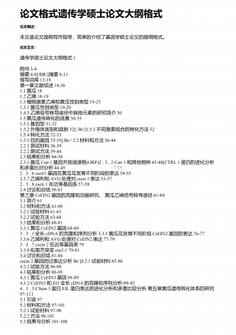 论文格式遗传学硕士论文大纲格式论文概述:本文是论文提纲写作指导,简单的介绍了基因学硕士论文的提纲格式。论文正文:遗传学硕士论文大纲格式1附件3-4摘要4-8[/BR/]摘要8-11缩写词库12-18第一章文献综述18-361.1黄瓜181.2乙烯18-191.3植物激素乙烯和黄瓜性别类型19-231.3.1黄瓜性别类型19-201.4.5乙烯信号转导途径中其他元素的研究简介301.5黄瓜遗传转化的进展30-351.5.1基因型31-321.5.2外植体类型和苗龄32[/Br/]1.5.3不同激素...