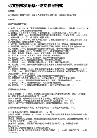 论文格式英语毕业论文参考格式论文概述:本文是参考文献写作指导,简单的介绍了英语毕业论文的一些参考文献格式范文。论文正文:英语毕业论文参考表11。布朗,H.(2006)。第二语言习得阅读材料。北京:[世界出版社/br/]2。埃利斯,R.(2000)。第二语言习得。上海:上海外语教育出版社3。霍维茨,E.K.&柯普J.(1986)。外语课堂焦虑。《现代语言杂志》,70(2):125-1324。霍维茨,英国(1986)。外语焦虑量表信度和效度的初步证据。TESOL季刊,20(2):559-562。5。...