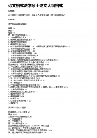 论文格式法学硕士论文大纲格式论文概述:本文是论文提纲写作指导,简单的介绍了法学硕士论文的提纲格式。论文正文:法学硕士论文大纲表1摘要3-4摘要4导言7-8第1章法官解释摘要8-131.1法官解释的含义81.2解释系统的起源和发展8-101.3解释性质的澄清10-111.4解释的分类11-131.4.1辩论解释和处理解释11-12.1解释制度与相关诉讼原则的关系13-172.1.1解释制度和辩论主义13-142.1.2解释制度和处置主义14-152.1.3解释制度和诉讼指挥权15-162.1.4解...