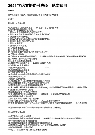 3658字论文格式刑法硕士论文题目论文概述:本文是论文题目精选,简单的列举了最新刑法硕士论文题目。论文正文:刑法硕士论文第一篇1——论班固刑法与官员治民思想以《汉书·艺志·武川》为例2论刑法中的法益秩序及其适用3《刑法关于危害环境行为的规定的研究》4《刑法关于人类遗传物质相关行为的规定的研究》5《刑法客观解释的研究》6《刑法关于欺骗和购买经济适用房的规定的研究》7《刑法》第361条实质性研究8《刑法扩展解释》9《非法人体刑事监管》10《刑法刑事政策》11《刑法信赖原则研究》12“”《我国刑法中的...