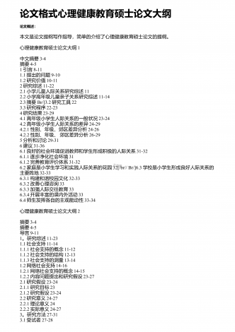 论文格式心理健康教育硕士论文大纲论文概述:本文是论文提纲写作指导,简单的介绍了心理健康教育硕士论文的提纲。心理健康教育硕士论文大纲1中文摘要3-4摘要4-51引言8-111.1提出的问题9-101.2研究价值10-112研究综述11-222.1小学儿童人际关系研究综述112.2小学高年级儿童亲子关系研究综述11-142.3摘要Br/]3.2研究工具223.3研究程序22-234研究结果23-294.1高年级小学生人际关系的一般状况23-244.2高年级小学生人际关系的差异24-294.2.1性别...