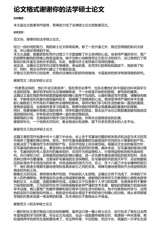 论文格式谢谢你的法学硕士论文论文概述:本文是论文致谢写作指导,简单的介绍了法律硕士论文的致谢范文。论文正文:范文怡,谢谢你的法学硕士论文。经过一段时间的努力,我的硕士论文即将结束。除了一些兴奋之外,我还觉得我的知识太肤浅,所以我经常感到不安。本文从选题、数据获取和写作过程三个方面凝聚了许立老师的心血。徐老师严谨的学识、宽广的视野和敏锐的思维让我受益匪浅。她不仅耐心地教我写论文的方法和技巧,还让我明白了获取知识和丰富生活的许多原因。在此,我要向许立老师表示深深的感谢。说实话,这篇论文的写作过程非常...