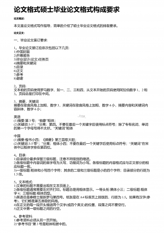 论文格式硕士毕业论文格式构成要求论文概述:本文是论文格式写作指导,简单的介绍了硕士毕业论文格式的排版要求。论文正文:一、毕业论文装订要求:1。毕业论文装订应依次包括以下几页:1)中国封面2)开幕报告3)毕业设计(论文)任务页4)摘要和关键词5)目录6)正文7)参考8)谢谢2。页码:文本前的页码使用罗马数字,如一、二、三和四,从文本开始的页码使用阿拉伯数字1、2和3。页码总是打印在中间。3,摘要,关键词摘要在歌曲风格上加粗,数字3,关键词在歌曲风格上加粗,数字4小,摘要内容和关键词内容斜体,数字4...