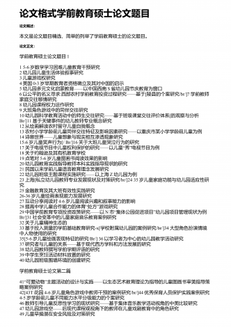 论文格式学前教育硕士论文题目论文概述:本文是论文题目精选,简单的列举了学前教育硕士的论文题目。论文正文:学前教育硕士论文题目115-6岁数学学习困难儿童教育干预研究2幼儿园儿童生活体验叙事研究3儿童游戏权研究4美国0-3岁早期教育者资格确立及其对中国的启示5——幼儿园多元文化启蒙教育以中国西南S省幼儿园节庆教育为窗口6以公平的名义寻求:——西部农村学前教育投资过程研究基于[陵县的个案研究/br/]7学前教师家庭交往移情研究8幼儿园课程权力运作研究9大班角色游戏中的同伴交往研究10——幼儿园科学教...