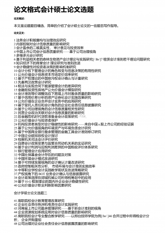 论文格式会计硕士论文选题论文概述:本文是论题题目精选,简单的介绍了会计硕士论文的一些题目写作指导。论文正文:1法务会计职能重构与治理效应研究2内部控制对会计信息质量的影响研究3会计盈余的二维真实性,审计意见与投资效率4——中国上市公司会计信息质量研究基于公司治理视角5多维多元会计研究6基于利益相关者的森林生物资产会计理论与实践研究[/Br/]7租赁会计准则若干理论问题研究8知识经济下的商誉会计:理论研究与准则改进9会计稳健性对投资者决策的影响机制研究10会计分权下管理会计的角色转变与信息决策的有...