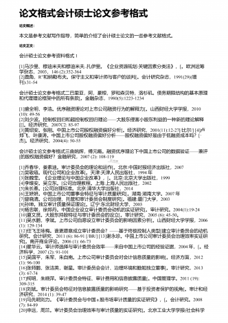 论文格式会计硕士论文参考格式论文概述:本文是参考文献写作指导,简单的介绍了会计硕士论文的一些参考文献格式。论文正文:会计硕士论文参考资料格式1[1]马沙里、穆迪米夫和穆迪米夫..扎伊里。《企业资源规划:关键因素分类法》,[。欧洲运筹学杂志,2003,146(2):352-364[2]鹿角,R”和纳勒布夫。保守主义和审计师与客户的谈判[。会计研究杂志,1991(29)(增刊):31-54会计硕士论文参考格式二巴里亚,阿,豪根,罗和森贝特,洛杉矶。债务期限结构的基本原理和代理理论框架中的所有条款[。...