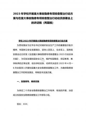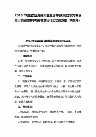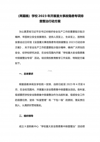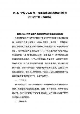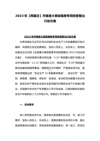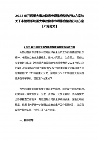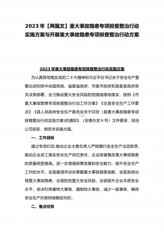 2023年关于重大事故隐患专项排查整治行动开展情况的报告与开展水上交通重大事故隐患专项排查整治行动实施方案【2篇范文】2023年关于重大事故隐患专项排查整治行动开展情况的报告为认真学习贯彻全国两会以来省州关于安全生产系列电视电话会议精神,全面落实县委县政府关于重大事故隐患专项排查整治行动的有关部署要求,县安办高度重视、认真实施,聚焦重点行业领域,在全县范围内开展了安全隐患大排查工作,着力遏制重特大和较大事故,控制一般事故,确保全县安全生产形势持续稳定。现将工作开展情况报告如下:一、工作开展情况安...