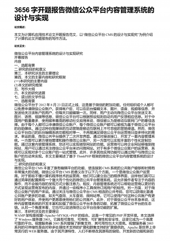 3656字开题报告微信公众平台内容管理系统的设计与实现论文概述:“本文为计算机应用技术论文开题报告范文,以微信公众平台CMS”的设计与实现究为例介绍了计算机论文开题报告的写作方法。论文正文:微信公众平台内容管理系统的设计与实现研究开幕报告内容一、选题背景二.研究的目的和意义第三,本研究涉及的主要理论第四,本文的主要内容和研究框架(一)本研究的主要内容(2)本文的研究框架五、写作大纲六、本文的研究进展七、读过的文学作品一、选题背景微信公众平台于2012年8月23日正式上线,这是基于微信的附加功能。...