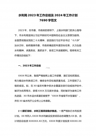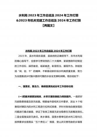 水利局2023年工作总结及2024年工作打算&2023年机关党建工作总结及2024年工作打算【两篇文】