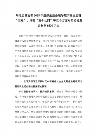 幼儿园党支部2025年组织生活会领导班子树立正确“五观”、增强“五个认同”等五个方面对照检视发言材料6520字文