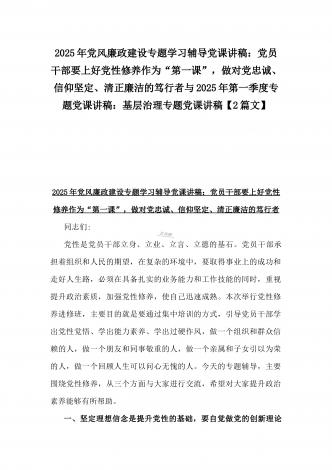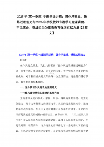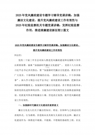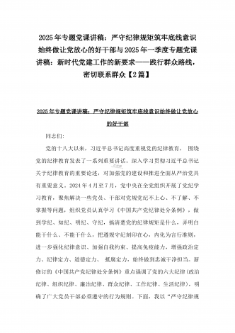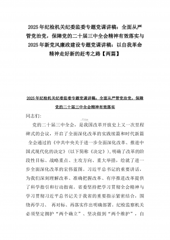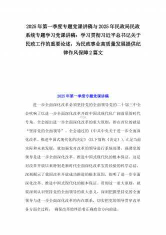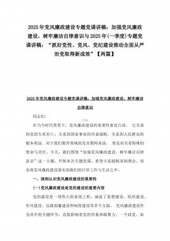 2025年专题党课讲稿:坚守底线,廉洁从政,以忠诚担当的干劲加强队伍党风廉政建设与2025年纪检机关纪委监委专题党课讲稿:继承光荣传统,做自我革命的表率、遵规守纪的标杆,打造忠诚干净担当、敢于善于斗争的纪检监察铁军【2篇文】2025年(一季度)专题党课讲稿:坚守底线,廉洁从政,以忠诚担当的干劲加强队伍党风廉政建设同志们:党风廉政建设是党的建设的重要组成部分,是新时期党的一项重大的政治任务。党风廉政建设是一场持久战,必须常抓不懈、久久为功,推进作风建设常态化长效化。正在开展的新时代中国特色社会主义...