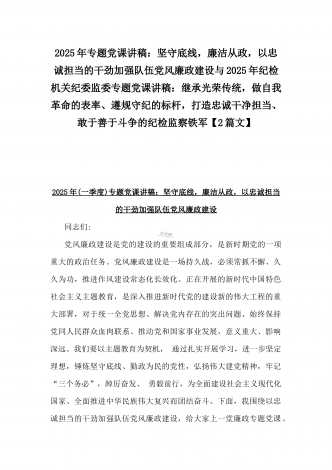 2025年专题党课讲稿:坚守底线,廉洁从政,以忠诚担当的干劲加强队伍党风廉政建设与2025年纪检机关纪委监委专题党课讲稿:继承光荣传统,做自我革命的表率、遵规守纪的标杆,打造忠诚干净担当、敢于善于斗争的纪检监察铁军【2篇文】