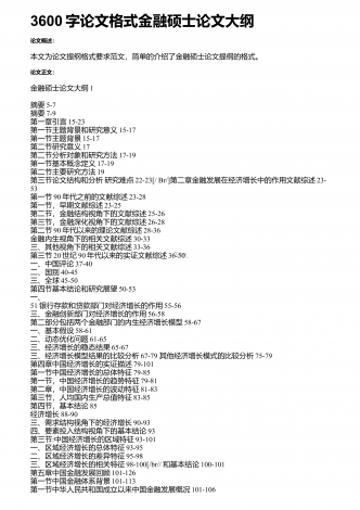3600字论文格式金融硕士论文大纲论文概述:本文为论文提纲格式要求范文,简单的介绍了金融硕士论文提纲的格式。论文正文:金融硕士论文大纲1摘要5-7摘要7-9第一章引言15-23第一节主题背景和研究意义15-17第一节主题背景15-17第二节研究意义17第二节分析对象和研究方法17-19第一节基本概念定义17-19第二节主要研究方法19第三节论文结构和分析研究难点22-23[/Br/]第二章金融发展在经济增长中的作用文献综述23-53第一节90年代之前的文献综述23-28第一节,早期文献综述23-...