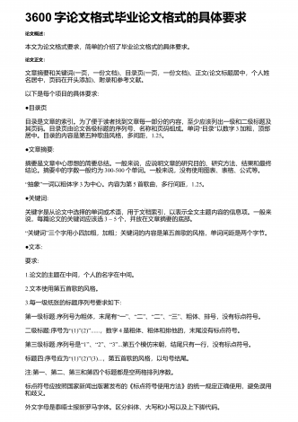 3600字论文格式毕业论文格式的基本要求论文概述:本文为论文格式要求,简单的介绍了毕业论文格式的基本要求。论文正文:一、论文的格式要求1。纸张打印在A4纸上;2.论文的标题在中间,小写以粗体显示,一般中文标题在两个十字之间。4.副标题4,歌曲风格,不粗体,居中5.论文的摘要、关键词、参考文献和正文都以宋体(不加粗)编号为4;一个大段落的标题是粗体的。6.“页码统一打印在右下角,格式为第x页,共x”页;7.全文的行距为1行。8.序列号排列如下:I.(前空两帧)-请将标题栏加粗(一)(正面空两个正方...