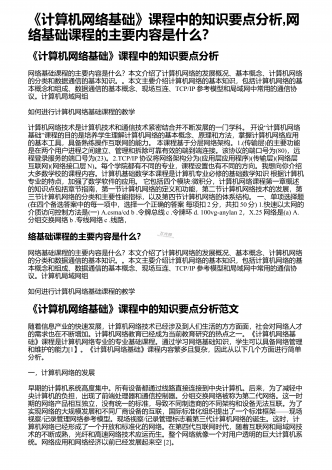 《计算机网络基础》课程中的知识要点分析,网络基础课程的主要内容是什么?《计算机网络基础》课程中的知识要点分析网络基础课程的主要内容是什么?本文介绍了计算机网络的发展概况、基本概念、计算机网络的分类和数据通信的基本知识。。本文主要介绍计算机网络的基本知识,包括计算机网络的基本概念和组成、数据通信的基本概念、现场互连、TCP/IP参考模型和局域网中常用的通信协议。计算机局域网组如何进行计算机网络基础课程的教学“计算机网络技术是计算机技术和通信技术紧密结合并不断发展的一门学科。开设计算机网络”基础课程...
