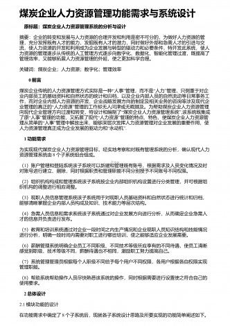 煤炭企业人力资源管理功能需求与系统设计 原标题:煤炭企业人力资源管理系统的分析与设计摘要:企业的转变和发展与人力资源的合理开发和利用是密不可分的,为做好人力资源的管理,充分发挥既有人才的能力,发掘既有人才的潜力,同时做好外部和急需人才的引进与交流,使人力资源的开发和利用成为企业发展与转型的驱动力和必要条件,特开发此系统,使人力资源的管理逐步从传统的人工管理方式逐步向数字化、数据化、智能化管理过渡,既提高了管理效率,又能够拓展人力资源管理的外延,使之更加科学合理。关键词:煤炭企业;人力资源;数字化...