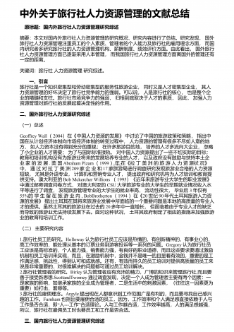 中外关于旅行社人力资源管理的文献总结 原标题:国内外旅行社人力资源管理研究综述摘要:本文对国内外旅行社人力资源管理的研究概况、研究内容进行了总结。研究发现,国外旅行社人力资源管理注重员工的个人素质、管理者的个人能力及旅行社的雇用理念方面,而国内研究者多研究旅行社的人力资源管理机构、薪酬制度、绩效评价方面。由此看出,国外旅行社人力资源管理方面已逐渐采用人本管理,而我国旅行社人力资源管理方面离国外的管理还有一定的距离。关键词:旅行社人力资源管理研究综述。 一、引言旅行社是一个知识密集型和劳动密集型...