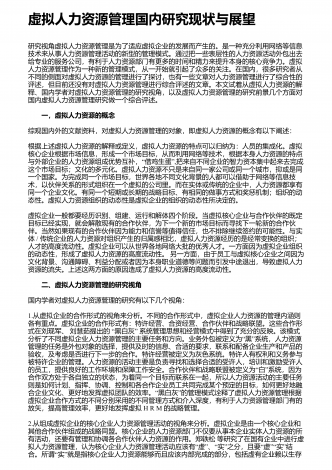 虚拟人力资源管理国内研究现状与展望研究视角虚拟人力资源管理是为了适应虚拟企业的发展而产生的。是一种充分利用网络等信息技术来从事人力资源管理活动的新型的管理模式。通过把一些表层性的人力资源活动外包出去给专业的服务公司,有利于人力资源部门有更多的时间和精力来提升本身的核心竞争力。虚拟人力资源管理作为一种新的管理模式,从一开始就引起了众多的关注。在国内,很多研究者从不同的侧面对虚拟人力资源的管理进行了探讨,也有一些文章对人力资源管理进行了综合性的评述,但目前还没有对虚拟人力资源管理进行综合评述的文章。...